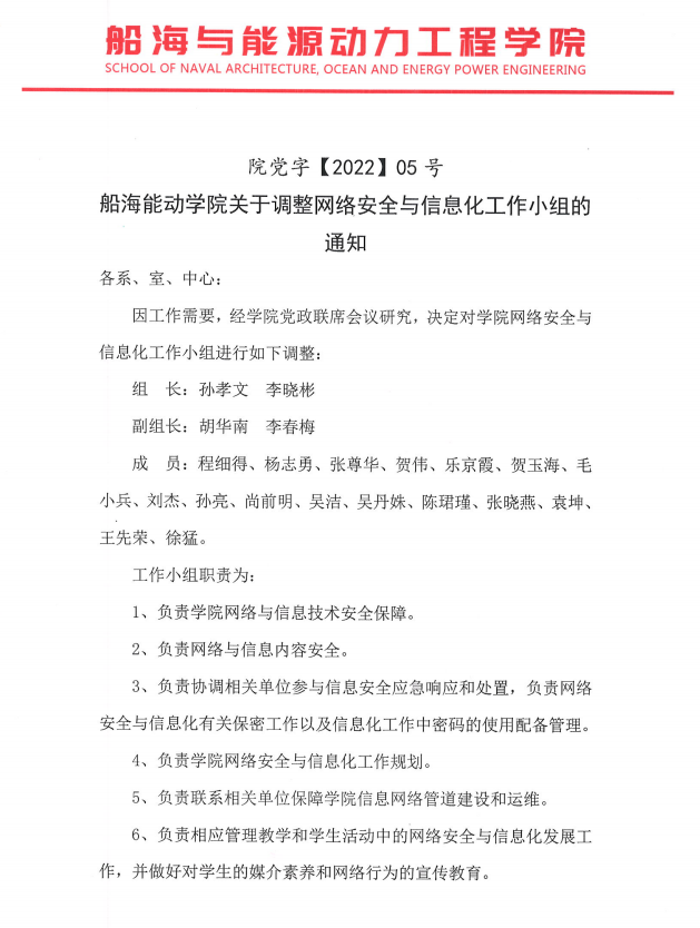 船海能动学院关于调整网络安全与信息化工作小组的通知